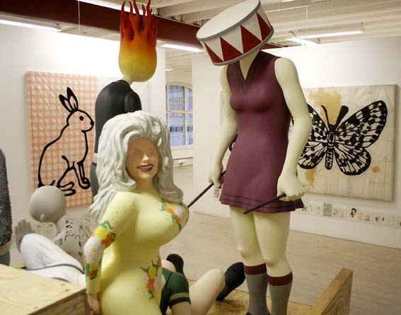 Jonas Kjellgren sculptures with John Rasimus prints and drawings in the background."studio 44" Stockholm 2005. |