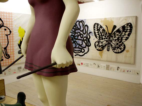 Jonas Kjellgren sculptur and John Rasimus "butterfly and krummilur" in the background."studio 44" Stockholm 2005. |
